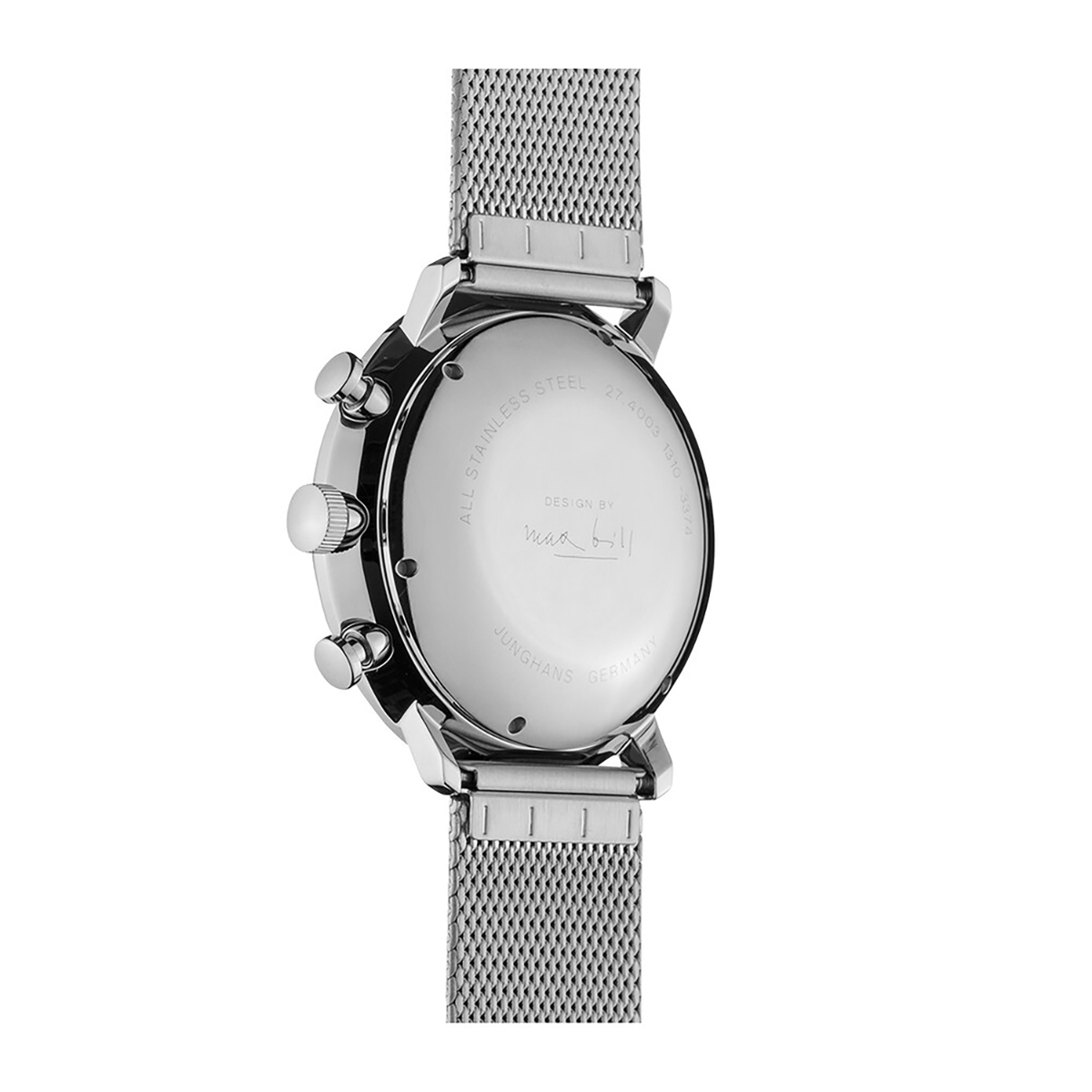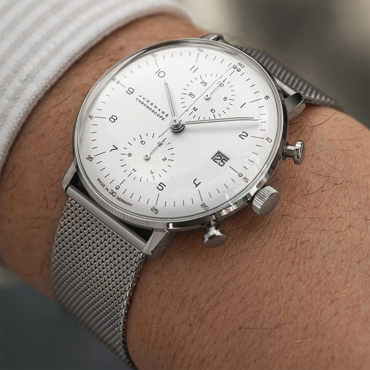Max Bill — architetto, pittore, scultore e allievo di Walter Gropius al Bauhaus — cominciò a progettare orologi per Junghans nel 1961. Il suo principio guida era irremovibile: la soluzione più semplice è sempre la migliore. La Chronoscope prolunga questa eredità con un quadrante bianco opaco di straordinaria nitidezza, depurato di ogni elemento superfluo. L'assenza deliberata della piccola seconda crea una simmetria immediatamente evidente tra i due contatori a ore 12 e 6. Le caratteristiche cifre arabe quadrate — il «4» ricorda notoriamente una sedia capovolta — e una minuteria attentamente proporzionata completano una composizione rimasta sostanzialmente invariata, perché non poteva essere migliorata in modo significativo. La funzione cronografo si aziona tramite due pulsanti a ore 2 e 4, mantenendo il profilo della cassa pulito e coerente con l'etica della collezione.