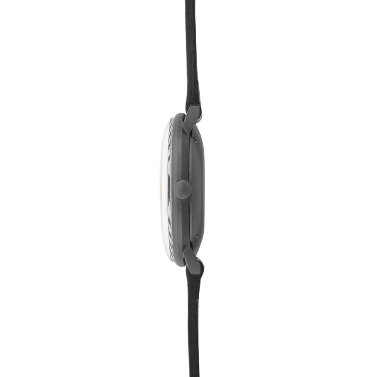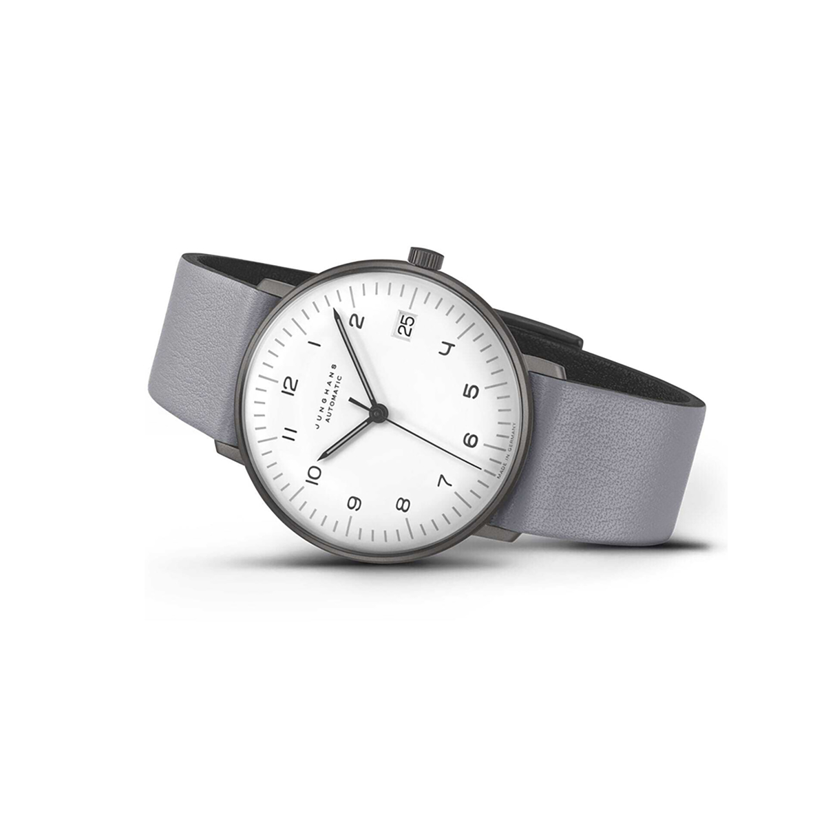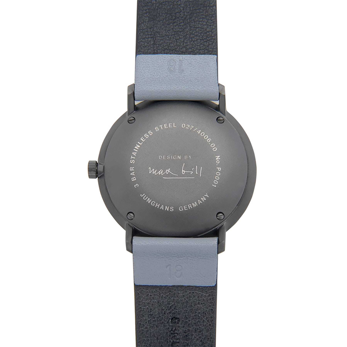 In 1961, Swiss architect, sculptor and Bauhaus-trained designer Max Bill created a series of wristwatches for Junghans that have remained almost unchanged ever since. The 27/4006.02 carries this legacy in a PVD-coated anthracite stainless steel case that adds contemporary depth while preserving the collection's signature restraint. The matte white dial presents clean baton indices and Max Bill's specially proportioned Arabic numerals — each numeral a miniature exercise in typographic clarity. Pencil-shaped hands and minute-track dots are filled with an environmentally friendly luminous substance, ensuring legibility long after dark. A convex sapphire crystal with dual-side anti-reflective coating completes the composition, lending the dial a quietly luminous depth characteristic of the finest dress watches.